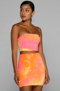 Keep it totally trendy in tie dye! This multi hued neon crop top features a straight strapless neckline and a cropped hem. The vibrant pink, neon yellow and orange hues compose a fun tie dye pattern. Be sure to pick up the matching skirt to complete your look!Model is 5'8" with a 32" bust, 23" waist and 36" hips. She is wearing a size small