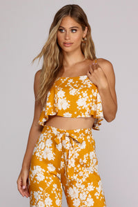 Look oh so fine in the summer sunshine with this adorable crop top! It features a sleeveless bodice, adjustable spaghetti straps, a square neckline, a back zipper closure, and a flowy ruffle woven overlay over a knit lining. The top showcases a pretty all over floral print to bring out those summer vibes. Don't forget to purchase the matching wide leg pants!Model is 5'6.5" with 32" bust, 23.5" waist and 35" hips. She is wearing a size small.