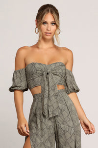 Channel only the chicest of nature vibes in this warm weather-ready printed crop top. It features an off-the-shoulder neckline, short sleeves with elasticized cuffs, and a cropped bodice with smocked back and tie-front bust. Top is partially lined and made from a lightweight rayon material with little to no stretch beyond smocking. Don't forget to pair it with the matching slit-front pants! Pants sold separately.Style Number/Barcode: 06003-0281