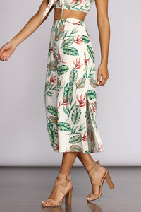 Show off that bronze tan, goddess! This midi skirt is just the thing we need for that vacay attire. Featuring an elastic banded waist band, buttons down the middle and a flared hem with slits on the sides. This midi also includes a smooth short skirt inner lining. This midi is composed of a palm leaf patterned canvas material that offers no stretch. Finish the look with the matching crop top!Model is 5'9" with a 34" bust, 24" waist and 35" hips. She is wearing a size small.