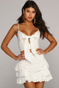 Take your summer crop up a notch in bright white with standout details. Top features adjustable spaghetti straps, a tie front, side zipper, and a darted bodice. Top is made from a soft, ultra lightweight woven material perfect for warm weather. Be sure and grab the matching skirt!Model is 5'9" with 32" bust, 24" waist and 34.5" hips. She is wearing a size small.