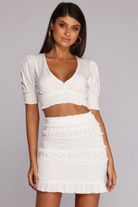 This crop top is pretty and ruched and ready for you to style! It features short sleeves, a V neckline, front ruched detailing, and a cropped hem. The white top is composed of a stretchy knit fabric that offers a form hugging fit. Complete your look with the matching mini skirt!Model is 5'8" with a 32" bust, 23" waist and 36" hips. She is wearing a size small.