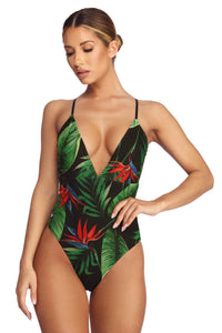 Hit the tropics in this vacay ready one piece! The black swimsuit features a plunging V neckline, adjustable narrow straps and a high cut with partial coverage bottom. The palm leaf print features green hues complemented with red hues. Swimsuit is composed of a lined mesh fabric that offers a form hugging fit with a moderate stretch. Be sure to pick up the matching cover up!Model is 5'6" with a 34" bust, 24" waist and 37" hips. She is wearing a size small.