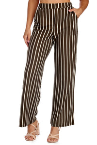 There's no denying, we're in love with stripes! Stay on trend with these chic pants that feature a high rise waist, hidden side pockets, a faux zipper seam and an elongating wide leg opening. The all over off-white hued narrow stripes are complemented with a brown background. Pants are composed of textured knit fabric that offers a form hugging fit with a moderate stretch. Be sure to pick up the matching top to complete your look!