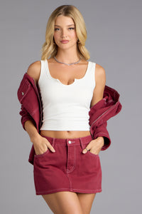 This denim skort keeps it casual-cool with contrast stitching and a form-hugging fit—perfect for everyday styling or weekend plans.