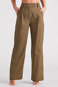 Make the shift into a breezy yet sophisticated style for the warmer season ahead! This linen-blend trouser pant features a high-rise waist, an extended tab with a button closure, belt loop accents, hidden side pockets, and a trendy wide-leg silhouette. Complete the look with the matching vest and pumps.