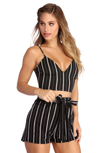 Stand out in trendy stripes in this cute black crop top! It features a sleeveless bodice, a V neckline, narrow shoulder straps and a cropped hem. The all over white contrasting stripes are complemented with a black background for a classic vibe! Be sure to pick up the matching shorts to complete your look!Model is 5'9" with a 32" bust, 24" waist and 34" hips. She is wearing a size small.