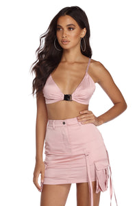 Sizes run small. Fit model recommends purchasing one size up.We're feeling this little satin top, literally! The crop top has a triangle cup bust that features a large, metal buckle and is paired with adjustable straps with an elastic stretch. The garment is composed of a smooth, pink satin fabric and has a wide, elastic back strap. Don't forget to purchase the matching skirt!