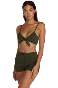 Sizes run small. Fit model recommends purchasing one size up.Babe, you make the right calls in this olive green crop top! It features a knot front detail at the bust, adjustable spaghetti straps,and an elastic back for extra comfort. Crop top is partially lined and composed of a soft knit fabric that offers a moderate stretch. Pair with matching bottoms to complete your look!