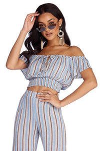 Stay stylish in stripes! This cute blue top features an elastic off the shoulder neckline, a small keyhole with a tie strap accent, short sleeves and a smocked cropped hem. The multi stripe design features vibrant hues to complement the blue background. Be sure to pick up the matching pants to complete your look! Garment offers a relaxed fit with a moderate stretch.Model is 5'8.5" with a 32" bust, 24" waist and 35" hips. She is wearing a size small.