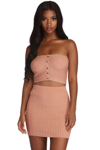 Style it right with this adorable ribbed knit tube top! It features a sleeveless bodice, a strapless neckline, a gold faux button down front, and a cropped hem. The taupe hued top offers plenty of stretch and a form hugging fit. Don't forget to purchase the matching mini skirt!