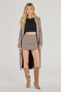 Layer on the chic style with this plaid mini skort designed with structured faux wool fabric. It features a high-rise waist, a mini-length overlay with a short side slit, and hidden fitted knit shorts for coverage. Style with the matching long coat!