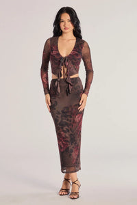 Channel your inner wild child with the wild blossom abstract print tie-front crop top. This sheer mesh beauty flaunts a V-neckline, long sleeves, and a ruffled hem for a flirty vibe.