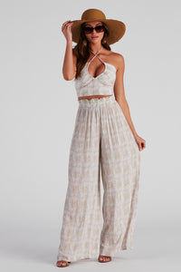 Can't you imagine wearing this striped halter top while sipping on a sangria? Set the tone for vacay-ready in these striped pants featuring a high-rise waist, paper bag style, and a wide-leg silhouette. Complete the look in the matching top.