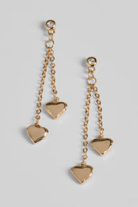 These earrings are sure to capture your heart! They feature a rhinestone post with dual chain links and heart charms for a sassy flair. Complete the look in heels for any event.