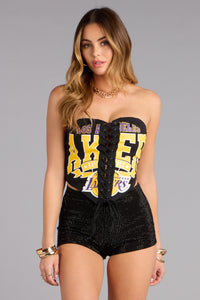 Ultra Game NBA Los Angeles Lakers Corset Top Ultra Game NBA Los Angeles Lakers Corset TopFrom courtside to girls’ night, this strapless Lakers corset top steals the spotlight with its lace-up front and bold team lettering. Equal parts sporty and sultry—because team spirit looks even better with a little edge. Fit & Features - Cotton knit stretchy fabric