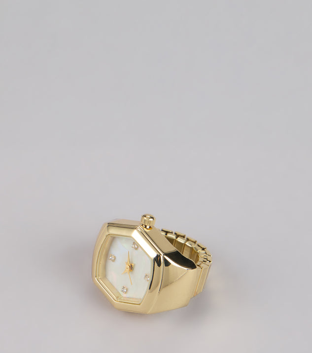 This hexagon-shaped watch ring sparkles with rhinestone trim and an iridescent face that catches every light. It’s part jewelry, part timepiece, and all statement.