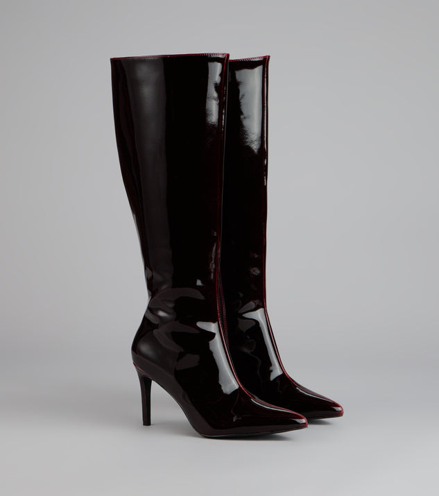 The kind of boot that owns every room. These patent stiletto knee boots serve glossy drama with a sculpted pointed toe and sleek silhouette—made for statement looks and confident strides.