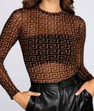Step out and stand out in this must have bodysuit! It features a mock neck, long fitted sleeves and a thong bottom with snap button closure. The all over Grecian inspired print is perfect for your favorite bottoms! Bodysuit is composed of a sheer unlined mesh fabric that offers a form hugging fit with a moderate stretch.