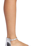 These trendy metallic flats are most def a must have for your closet! They feature a closed back with an around the ankle adjustable strap and a pointed toe. The shoes are composed of a metallic silver faux leather material.